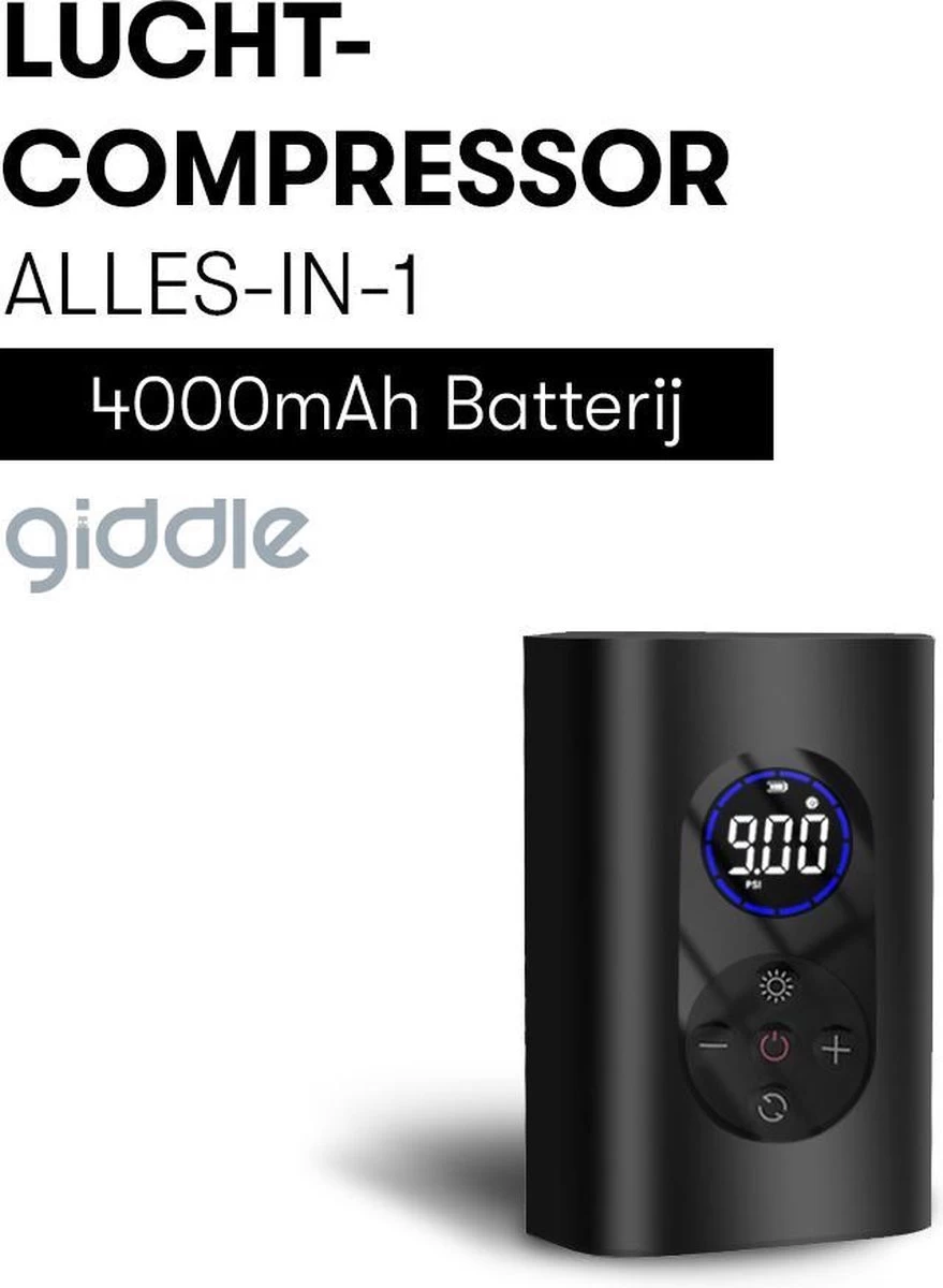 De Giddle alles-in-1 luchtcompressor & powerbank komt geleverd met: