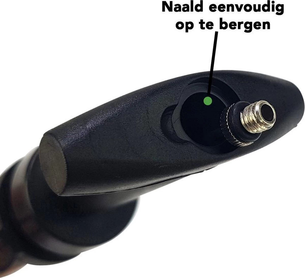 Zowel bij de op- als neerwaartse beweging blaast deze pomp lucht in de bal of de band. Dit maakt van deze pomp een handige en gemakkelijke tool. De duurzame, lichte pompbuis is van een kunststof materiaal. Deze pomp wordt geleverd met een verloopstuk en een verlengstuk: dit stuk gereedschap mag niet ontbreken in je huis. Raak je naalden nooit meer kwijt: die zitten netjes weg in het handvat. Handig toch?